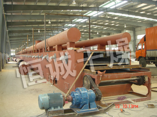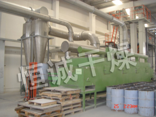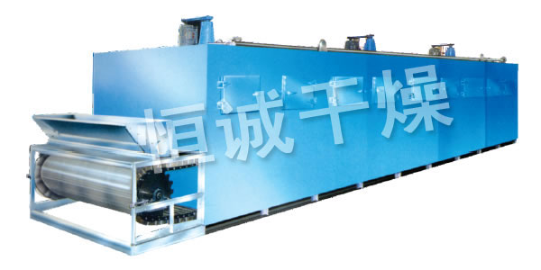 物料由加料器均勻地鋪在網(wǎng)帶上,網(wǎng)帶一般采用12-60目不銹鋼絲網(wǎng),由傳動(dòng)裝置拖動(dòng)在干燥機(jī)內(nèi)移動(dòng)。干燥機(jī)由若干單元組成,每一單元熱風(fēng)獨(dú)立循環(huán),部分尾氣由專門排濕風(fēng)機(jī)排出,廢氣由調(diào)節(jié)閥控制,熱氣由下往上或由上往下穿過(guò)鋪滿物料的網(wǎng)帶完成熱量與質(zhì)量傳遞的進(jìn)程,帶走物料水份。網(wǎng)帶緩慢移動(dòng),運(yùn)行速度可根據(jù)物料溫度自由調(diào)節(jié),干燥后的成品連續(xù)落入收料器中。上下循環(huán)單元根據(jù)用戶需要可靈活配備,單元數(shù)量亦可根據(jù)需要選取。