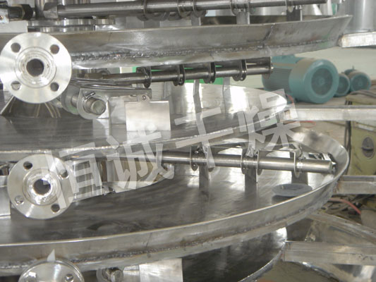 濕物料自加料器連續(xù)地加到干燥器上部第一層干燥盤上,帶有耙葉的耙臂作回轉(zhuǎn)運(yùn)動(dòng)使耙臂作回轉(zhuǎn)運(yùn)動(dòng)使耙葉連續(xù)地翻抄物料。物料沿指數(shù)螺旋線流過干燥盤表面,在小干燥盤上的物料被移送到外緣,并在外緣落到下方的大干燥盤外緣,在大干盤上物料向里移動(dòng)并從中間落料口落如下一層小干燥盤中。大小干燥盤上下交替排列,物料得以連續(xù)地流過整個(gè)干燥器。中空的干燥盤內(nèi)通入加熱介質(zhì),加熱介質(zhì)形式有飽和蒸汽、熱水和導(dǎo)熱油,加熱介質(zhì)由干燥盤的一端進(jìn)入,從另一端導(dǎo)出。已干物料從^后一層干燥盤落到殼體的底層,^后被耙葉移送到出料口排出。濕份從物料中逸出,由設(shè)在頂蓋上的排濕口排出,真空型盤式干燥器的濕氣由設(shè)在頂蓋上的真空泵口排出。從底層排出的干物料可直接包裝。通過配加翅片加熱器、溶劑回收冷凝器、袋式除塵器、干料返混機(jī)構(gòu)、引風(fēng)機(jī)等輔機(jī),可提高其干燥的生產(chǎn)能力,干燥膏糊狀和熱敏性物 料,可方便地回收溶劑,并能進(jìn)行熱解和反應(yīng)操作。